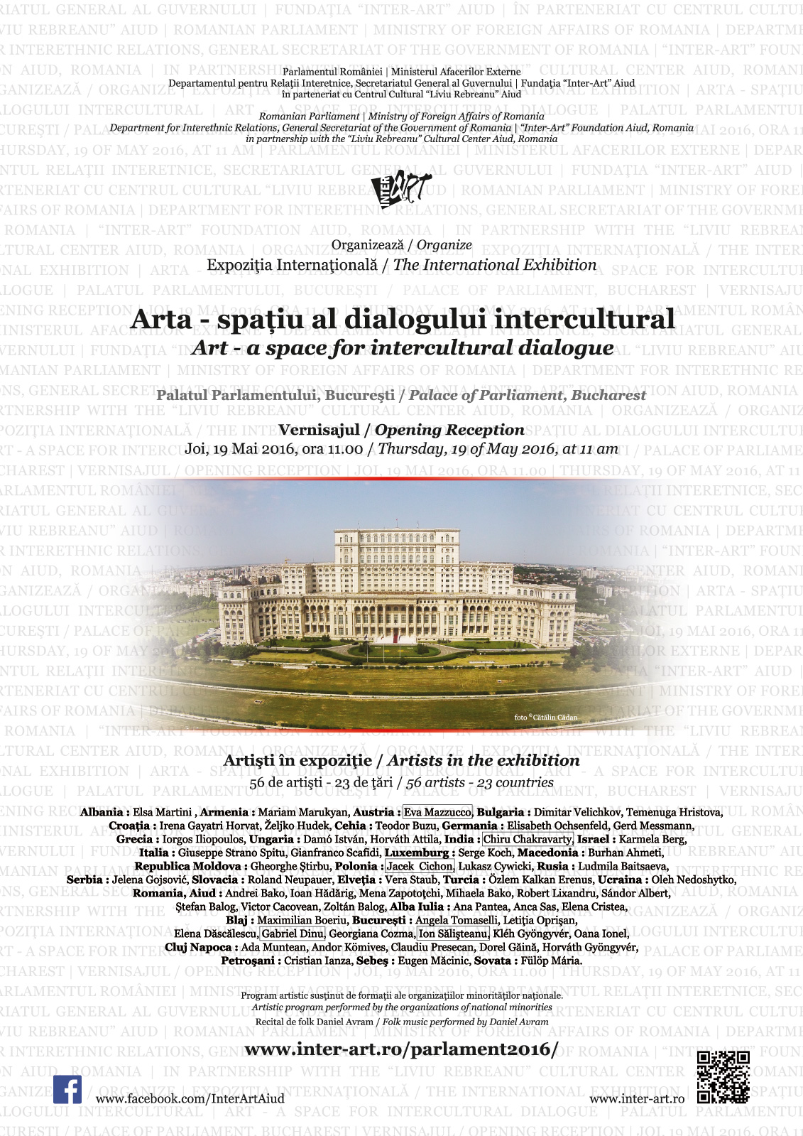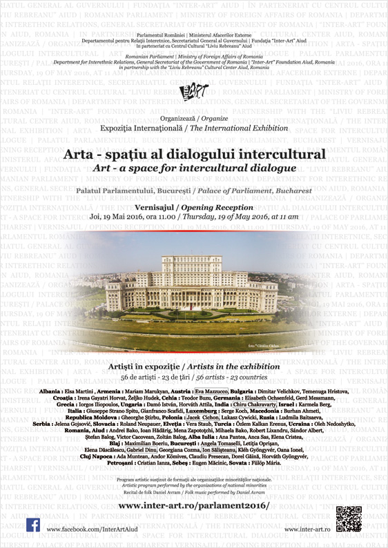 Dorim sa aducem în atenţia publicului din Bucureşti o expoziţie internaţională de artă plastică, sinteză a proiectelor Inter-Art cuprinzând lucrări de pictură, grafică şi sculptură de la 55 de artişti de talie internaţională din 22 de ţări de pe toate continentele lumii. Vor avea loc prezentări de carte, de albume de artă şi un recital de muzică folk.